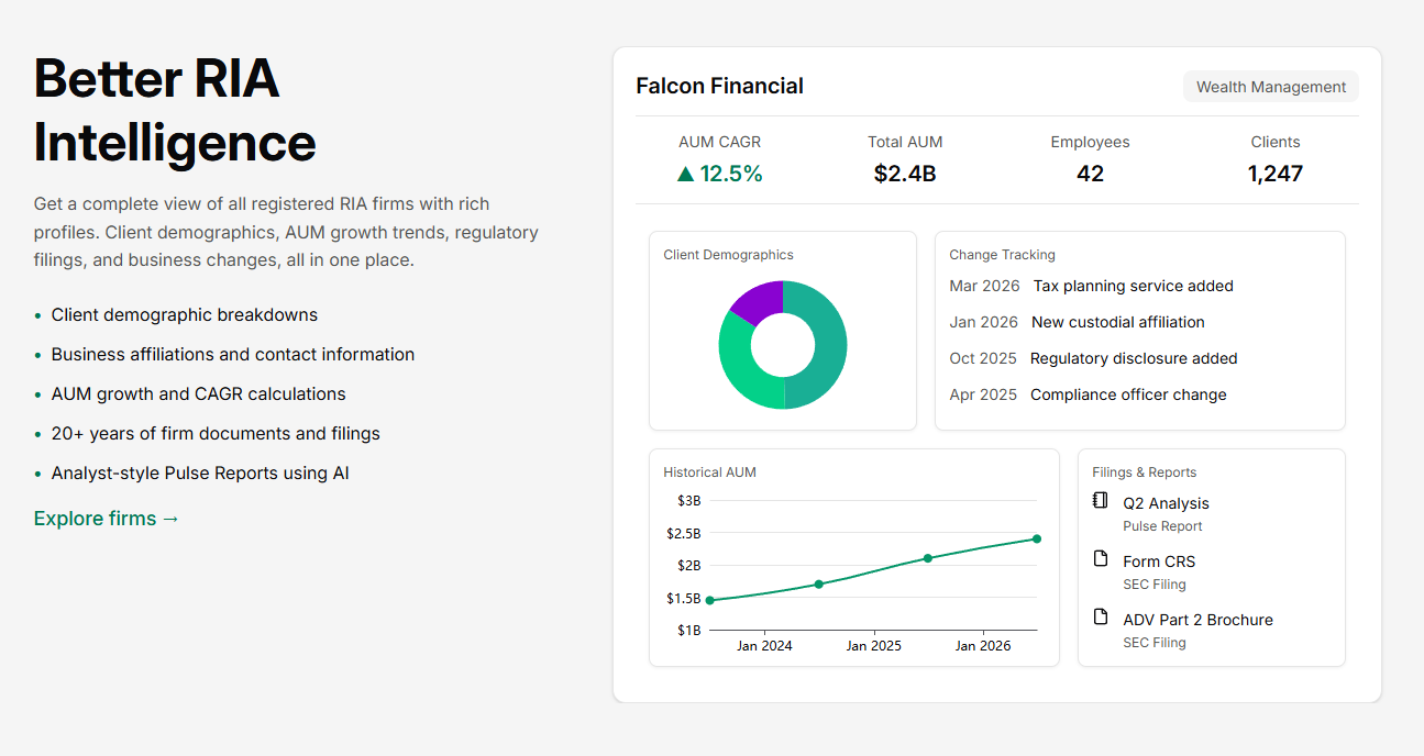 A Bloomberg terminal for the RIA Ecosystem. RIA Pulse solves the RIA data crisis as the world’s first open and accessible tool for analyzing normalized ADV data.